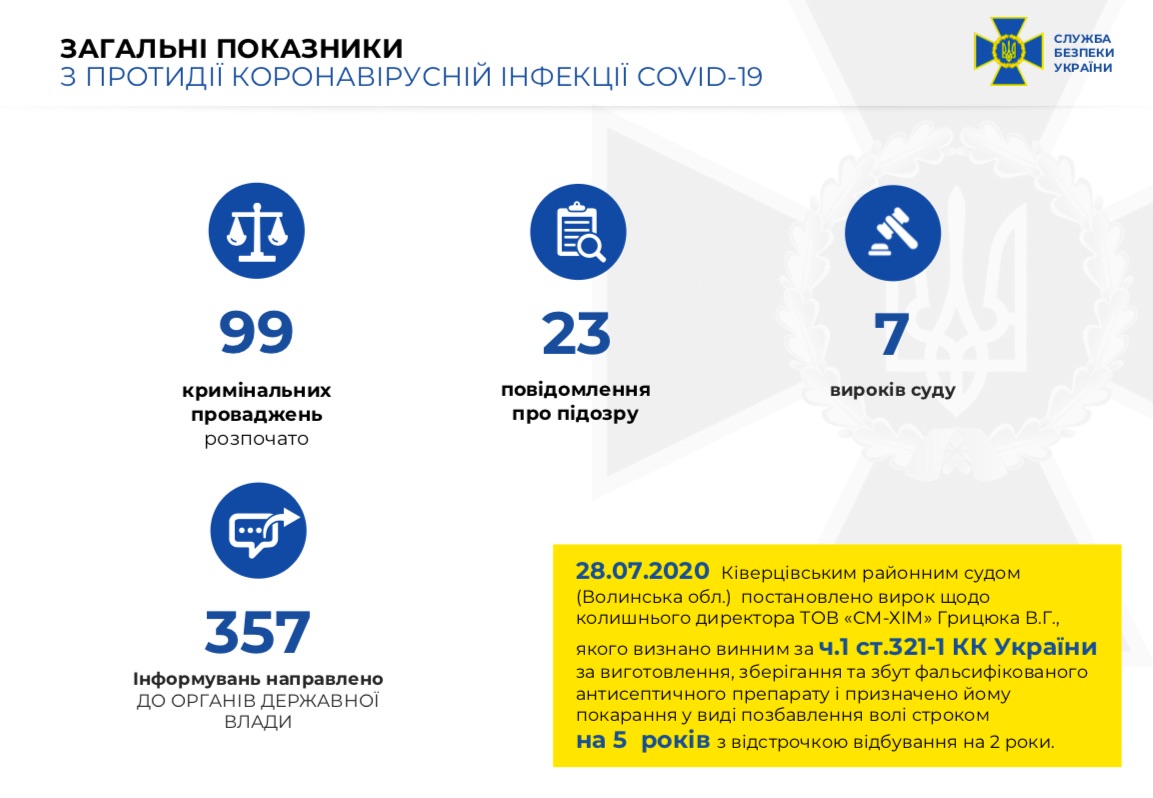За матеріалами Служби безпеки України зареєстровано 99 кримінальних проваджень стосовно злочинів і зловживань на коронавірусній пандемії. У межах розслідувань вже оголошено 23 повідомлення про підозру.