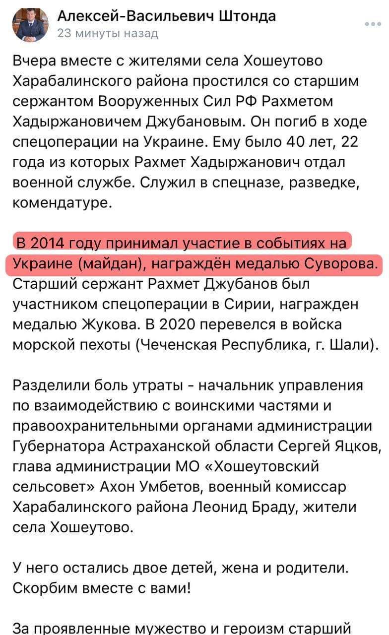 Зазначається, що загиблий, можливо, був учасником так званої "чорної роти". Так називалася група військовослужбовців, які вбивали людей на Майдані 2014 року. У некролозі окупанта зазначені його "заслуги перед Батьківщиною", серед яких – участь у подіях Революції Гідності, а також у бойових діях у Сирії та Україні. За масові вбивства цивільного населення Джубанова було представлено до кількох нагород.