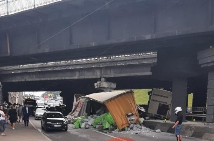 Вантажівка перекинулася і зачепила кілька автівок під мостом у Києві (Фото, Відео)