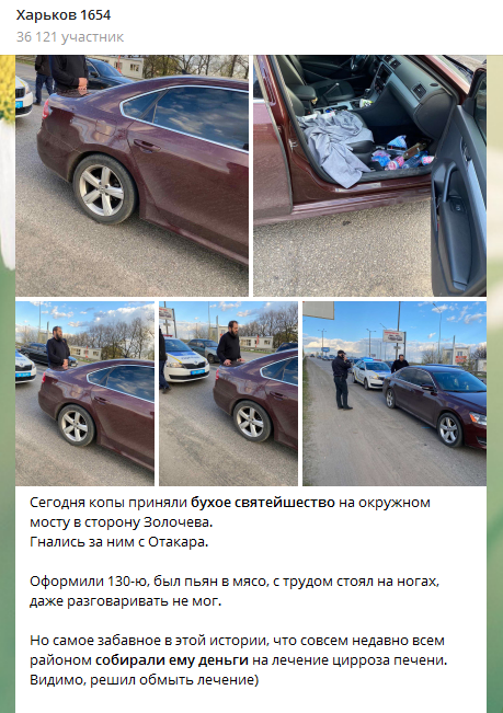 Повідомляється, що після того, як священника змогли зупинити, з'ясувалося, що він перебуває в сильному алкогольному сп'янінні. Поліція застосувала санкції до священика, оформивши його порушення за 130 статтею адміністративного кодексу. "Оформили 130-ю, був п'яний у м'ясо, ледь стояв на ногах, навіть розмовляти не міг", - повідомляє "Харків 1654". Також автор повідомлення розповів, що недавно даний священик збирав допомогу на лікування у нього цирозу печінки.