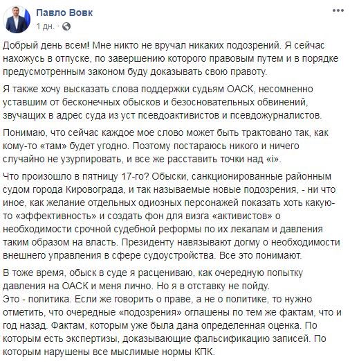 Голова Окружного адміністративного суду також заявив, що у відставку йти не збирається, а обшуки вважає тиском на суд. "В той самий час, обшук в суді я розцінюю, як чергову спробу тиску на ОАСК і мене особисто. Але я у відставку не піду", - пише Вовк, повідомивши, що в даних слідчих процедурах порушені норми кримінально-процесуального кодексу.