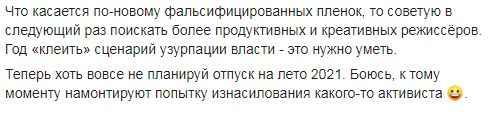Також глава Окружного адмінсуду заявив, що плівки, що компрометують його, фальсифіковані. "Що стосується по-новому фальсифікованих плівок, то раджу наступного разу пошукати більш продуктивних і креативних режисерів. Рік "клеїти" сценарій узурпації влади — це потрібно вміти", - заявив Вовк.