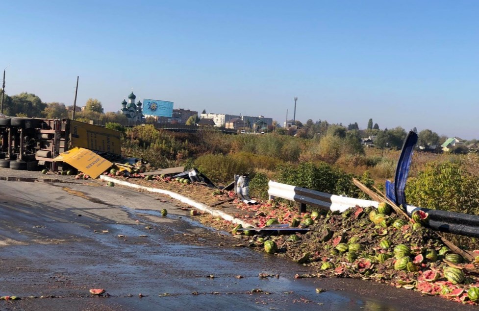 Фура з кавунами перекинулася на кільцевій розв’язці дороги. ДТП було зафіксовано 15 жовтня у містечку Володарка Київської області.