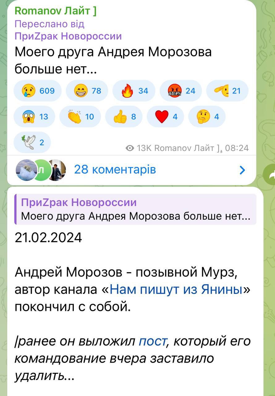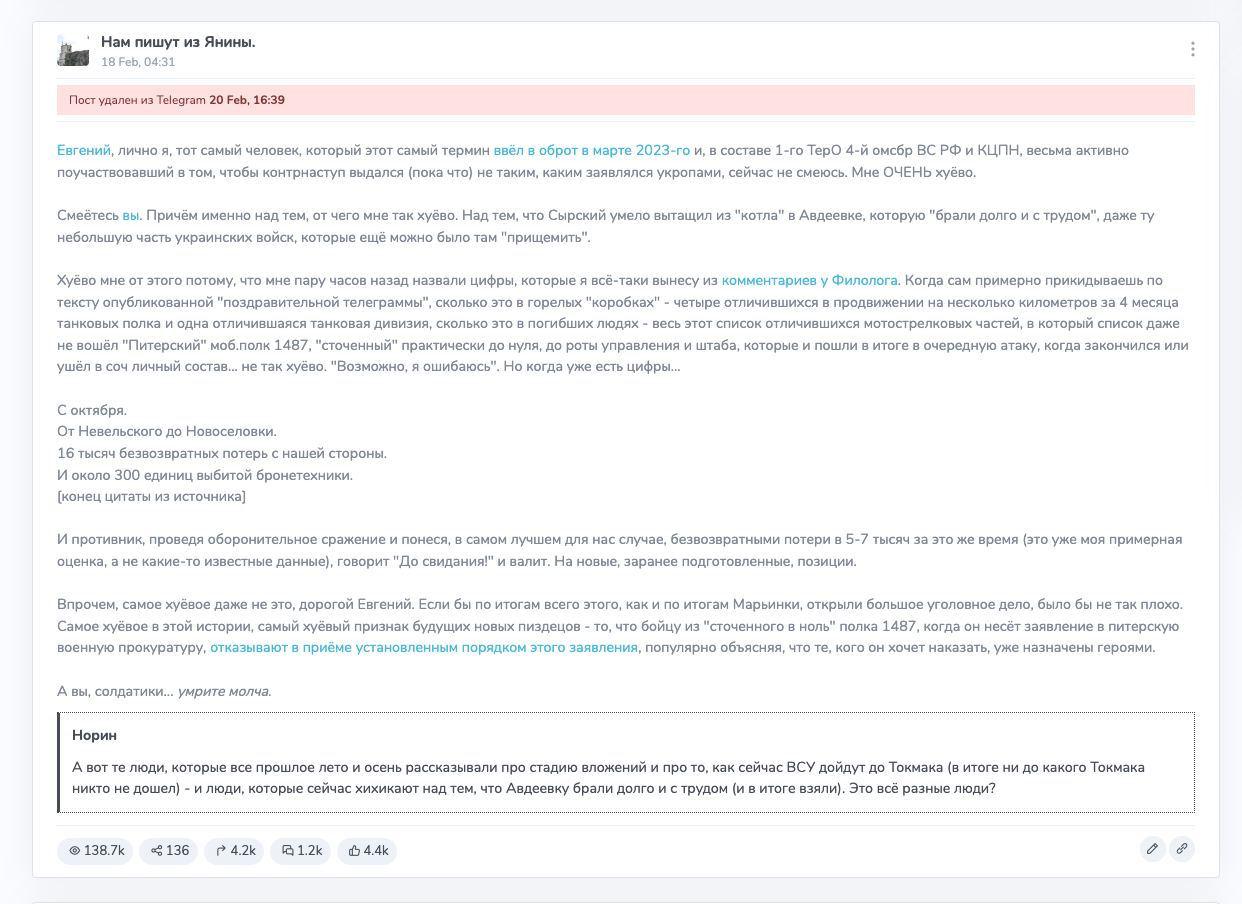З його слів, під Авдіївкою росія втратила 16 тис. солдат. Опублікувавши цю інформацію на своїй сторінці, вороже командування почало змушувати його видалити пост, а інші пропагандисти почали цькувати його за те, що він розкрив правду.