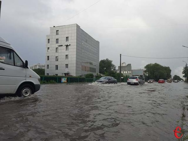 У Хмельницькому 4 серпня сильна злива паралізувала транспорт. Вода піднялася приблизно до рівня поясу людини.