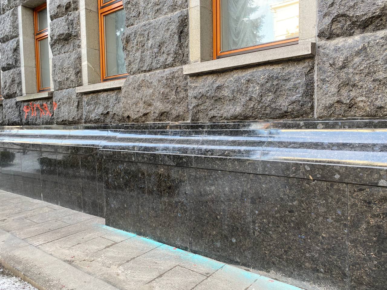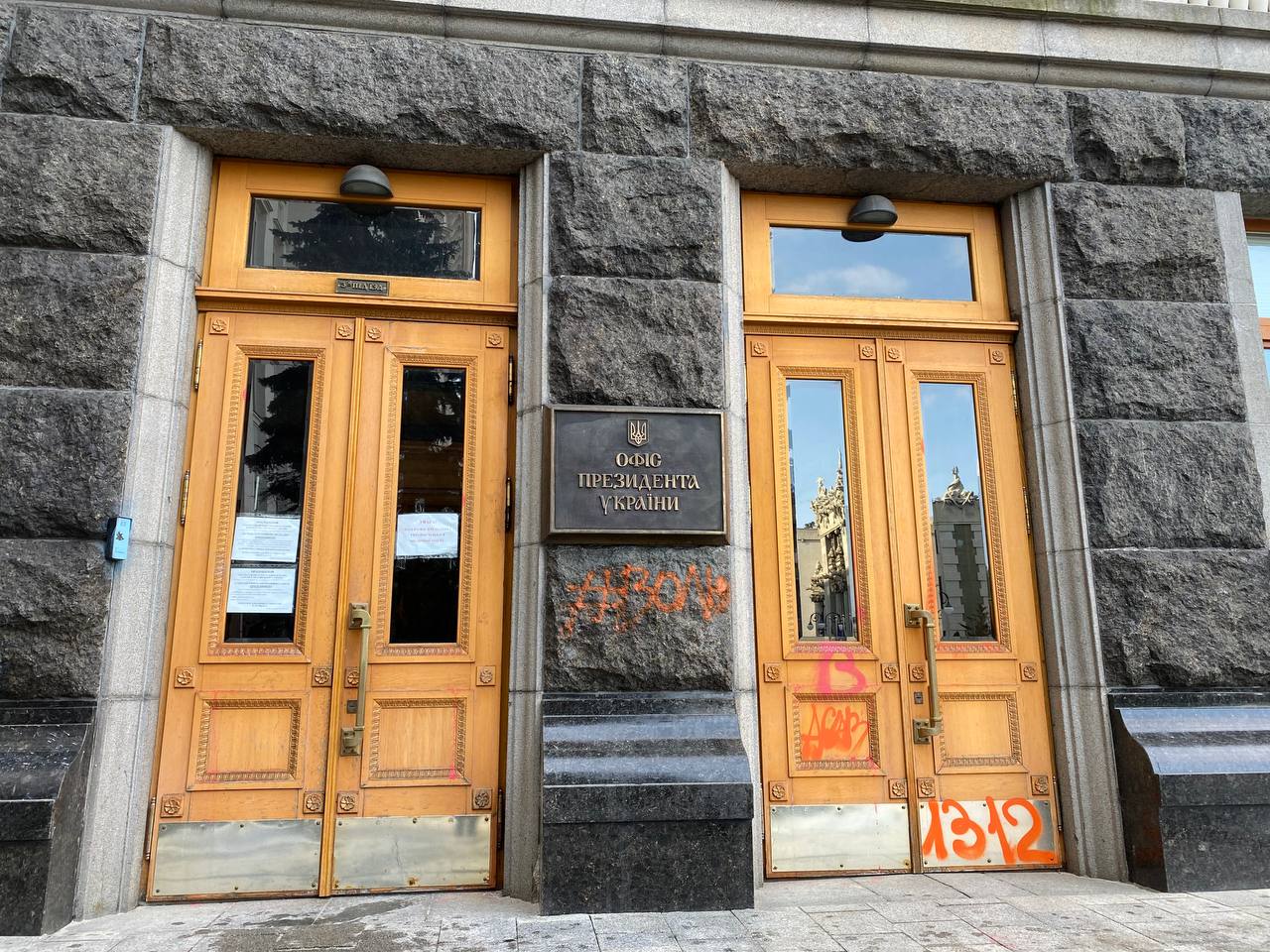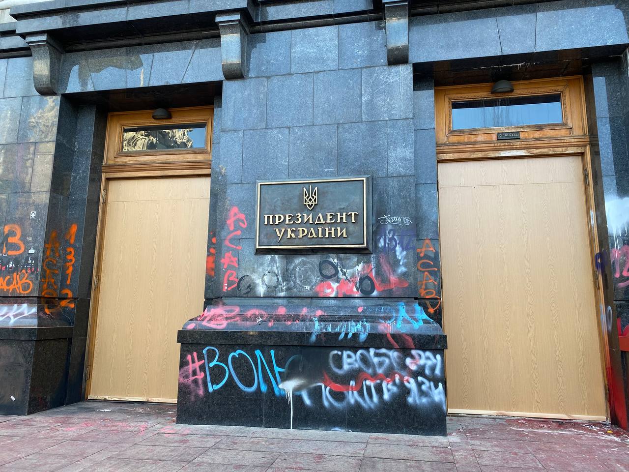 У суботу 20 березня сторонники активіста та блогера розписали стіни будівлі нецензурною лайкою, а також підпалили табличку "Президент України", де знаходиться герб України. 22 березня кореспондент ASPI news показав, як почалися очисні роботи під ОП.
