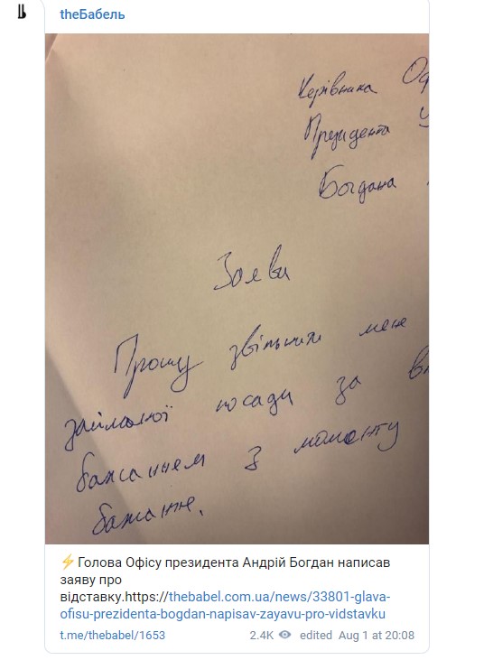 Андрій Богдан, який є главою Офіса президента України, написав заяву про звільнення за власним бажанням.