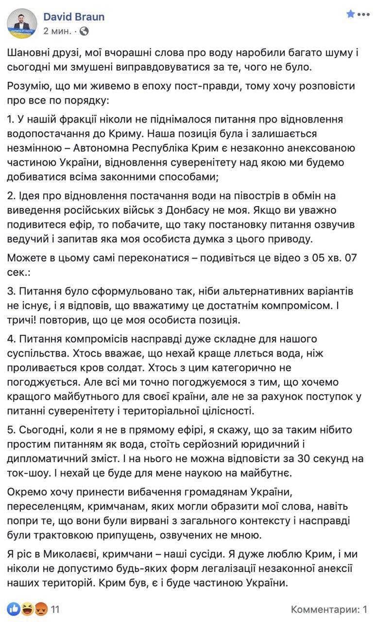 "У нашій фракції ніколи не піднімалося питання про відновлення водопостачання до Криму. Наша позиція була і залишається незмінною – Автономна Республіка Крим є незаконно анексованою частиною України, відновлення суверенітету над якою ми будемо добиватися всіма законними способами", - написав Арахамія.