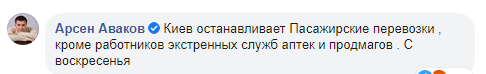 "Київ зупиняє пасажирські перевезення, крім працівників екстрених служб аптек і продмагів. З неділі", - написав Аваков.