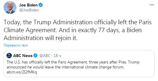 Так, сьогодні, 5 листопада, Джо Байден у своєму Твіттері повідомив, що його адміністрація повернеться через 77 днів до Паризької угоди щодо клімату, з якої щойно вийшов Дональд Трамп. Байден таким чином підписав посилання від видання ABC, яке повідомило, що США офіційно виходять з Паризької угоди, спрямованої на боротьбу зі зміною клімату.