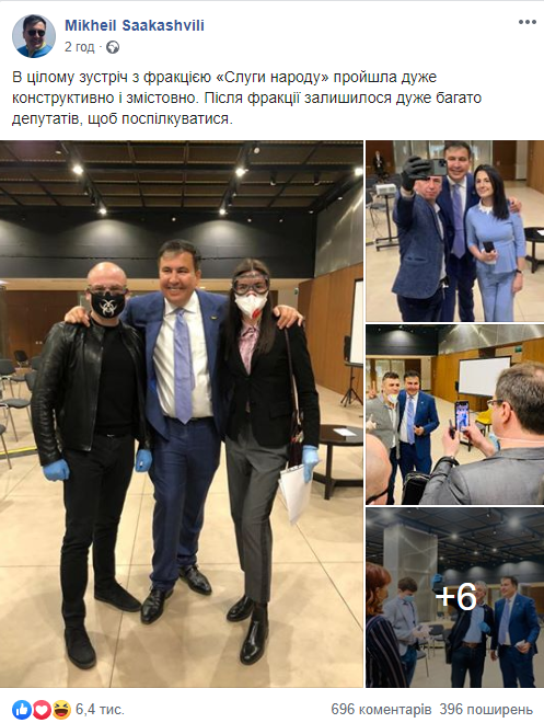 Колишній президент Грузії, екс-голова Одеської облдержадміністрації Міхеїл Саакашвілі зустрівся з фракцією "Слуга народу". Він поділився враженнями від зустрічі. За словами Саакашвілі, після зустрічі залишилося дуже багато депутатів від СН, щоб поспілкуватися з ним. Фотографії із зустрічі Саакашвілі розмістив на своїй сторінці в Facebook.