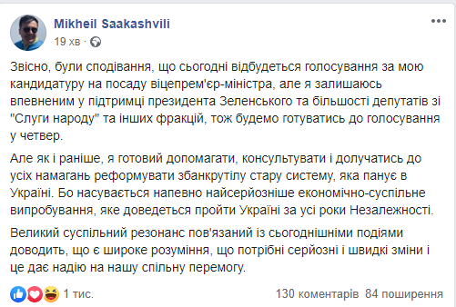 Раніше повідомлялося, що 22 квітня Саакашвілі заявив, що отримав від президента Володимира Зеленського пропозицію стати віце-прем'єром з питань реформ. Втім, він поки що не дочекався голосування за свою кандидатуру, про що вже також написав у соцмережі.