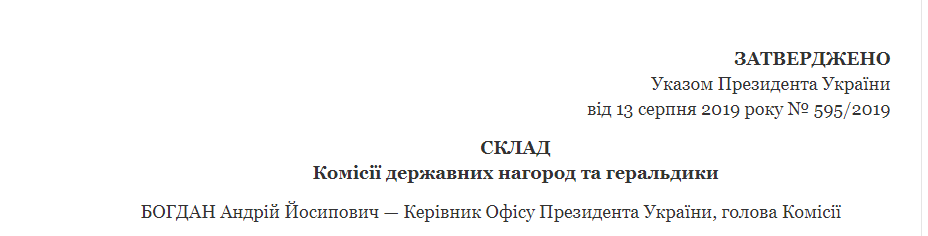 Президент Володимир Зеленський призначив керівника Офісу президент Андрія Богдана головою комісії державних нагород та геральдики.
