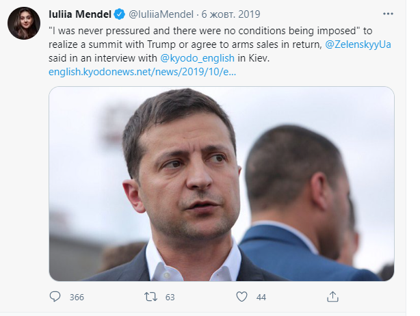 Ще один курйоз стався, коли Мендель інформувала у Twitter, що Зеленський дав інтерв'ю японському виданню Kyodo, назвавши столицю України не "Куiv", а "Kiev". Після хвилі обурення вона вибачилась за свою помилку.