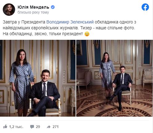 Пізніше Мендель виклала у соцмережі фототизер до виходу журналу, де на знімку прессекретарка стояла поруч із Зеленським, тримаючи руку біля його плеча. Такий знімок багатьом користувачам видався не надто офіційним.