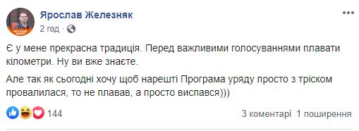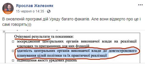 Фракція “Голос” уже заявила про те, що не голосуватиме за цей документ. Нардеп Ярослав Железняк, приміром, заявив на погоджувальній раді: якщо у першому варіанті програма нагадувала реферат, то в останньому - курсову першокурсника. А у своєму Facebook вранці у четвер, 18 червня, написав, що хоче, аби програма Кабміну провалилася з тріском.