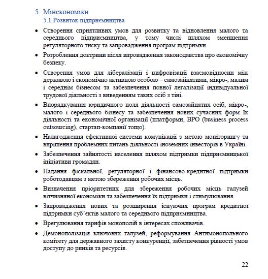 Депутатка Тетяна Плачкова з ОПЗЖ у своєму Facebook розкритикувала програму за надмірну кількість лозунгів, підвищення ефективності роботи державних підприємств шляхом їх приватизації, обіцянки не робити, а сприяти. Особливо її стурбувала відсутність конкретики, часових орієнтирів і кількісних показників та невідповідність деяких положень новому меморандуму з МВФ.