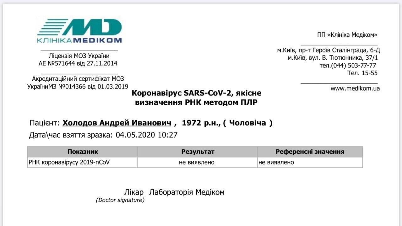 Депутат Холодов, який залишався на Кіпрі через коронавірус, показав довідку з результатом ПЛР-тесту (Фото)