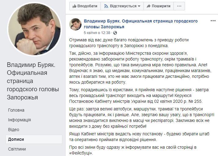 "Порадившись з юристами, я прийняв наступне рішення-завтра весь громадський транспорт виходить на маршрути! Керуюся постановою Кабінету Міністрів України від 02 квітня 2020 р.No 255. Ще раз: завтра великі автобуси, маршрутки, трамваї та тролейбуси працюватимуть, як і раніше. Але, звертаю вашу увагу, що в транспорті можна перебувати виключно в масці або респіраторі. Закликаю всіх не виходити з дому без крайньої необхідності! Якщо Кабінет Міністрів видасть нову постанову - будемо збирати штаб і оперативно приймати відповідні рішення", -зазначено в повідомленні Буряка в Facebook 5 квітня.