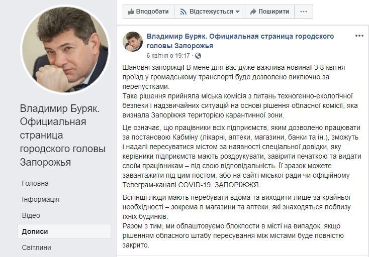 Однак через добу, він написав пост протилежний за контекстом, в якому він оголосив, що з середи, 8 квітня проїзд в громадському транспорті буде дозволений виключно за перепустками. Буряк повідомив, що транспорт буде перевозити тільки співробітників стратегічних підприємств таких як магазини, аптеки, співробітників оперативних служб.