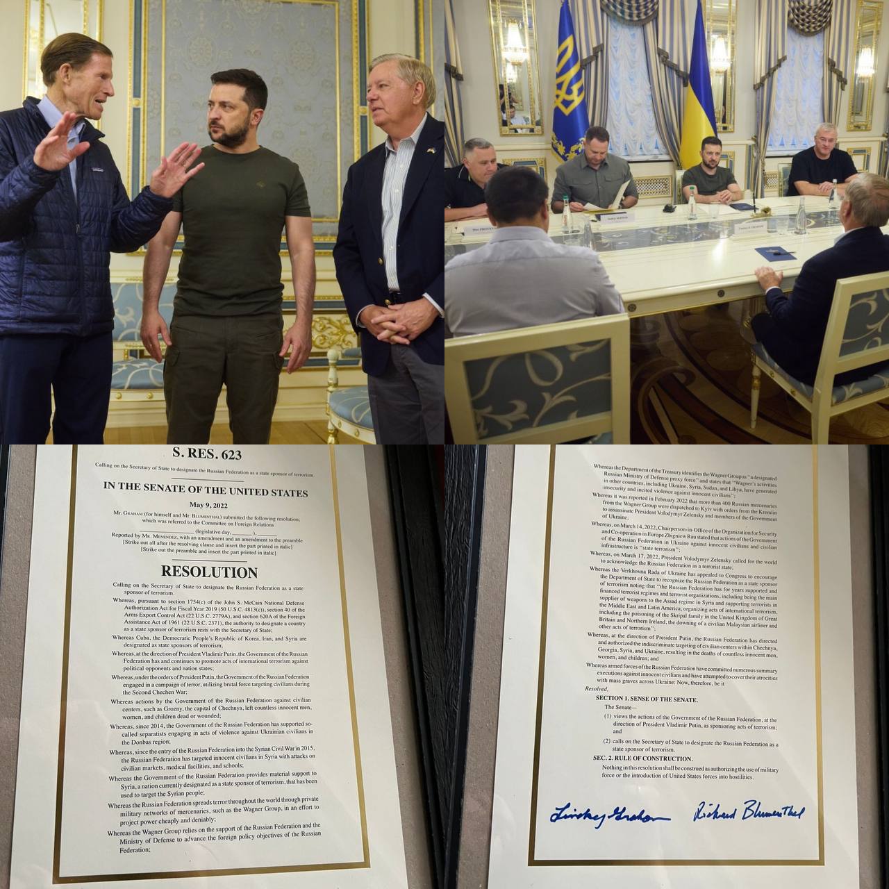 Єрмак написав у Telegram: «Ліндсі Грем та Річард Блюменталь є співавторами резолюції із закликом до держсекретаря Ентоні Блінкена визнати Росію країною-спонсором тероризму, яку у червні підтримав Комітет Сенату Сполучених Штатів із міжнародних відносин. Сенатори вручили нам копію резолюції.