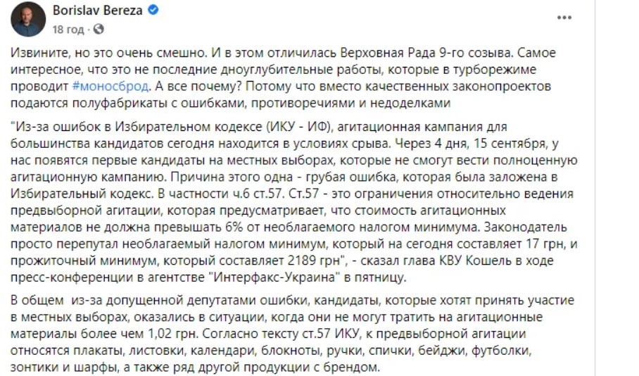 На агітаційні матеріали депутати забов'язані витрачати не більш як 1,02 гривень. Про це 12 вересня повідомив колишній нардеп Борислав Береза на сторінці у "Фейсбук".