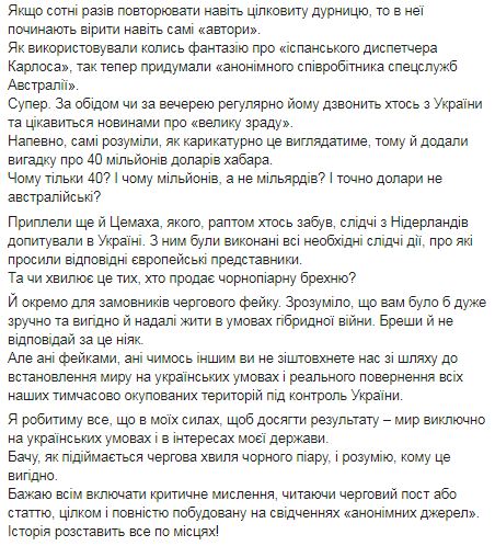 Також він згадав суму "хабара" йому - 40 мільйонів доларів. "Чому тільки 40? І чому мільйонів, а не мільярдів? І точно долари не австралійські? Приплели ще й Цемаха, якого, раптом хтось забув, слідчі з Нідерландів допитували в Україні. З ним були виконані всі необхідні слідчі дії, про які просили відповідні європейські представники", - додав він.