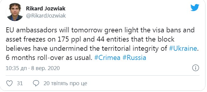 Санкції застосують проти певних осіб та суб'єктів, які відповідальні за підрив суверенітету та територіальної цілісності України. Про це 8 вересня повідомив у "Твіттері" Рікард Джозвяк, кореспондент "Радіо Свобода".