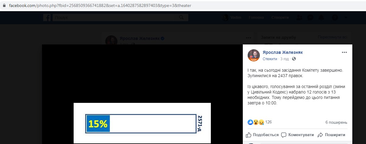 "І так, на сьогодні засідання Комітету завершено. Зупинилися на 2437 правок. З цікавого, голосування за останній розділ (зміни у Цивільний Кодекс) набрало 12 голосів з 13 необхідних. Тому перейдемо до цього питання завтра о 10:00", - написав перший заступник голови комітету ВРУ з питань фінансів Ярослав Железняк на своїй сторінці у Facebook.
