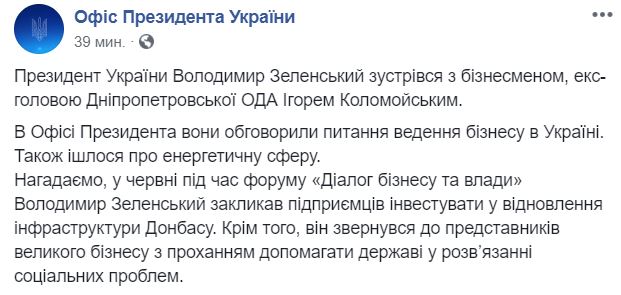 Президент України Володимир Зеленський і прем'єр-міністр України Олексій Гончарук зустрілися з бізнесменом, колишнім головою Дніпропетровської ОДА Ігорем Коломойським.