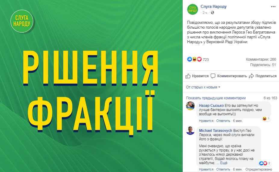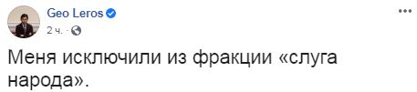 "Повідомляємо, що за результатами збору підписів більшістю голосів народних депутатів ухвалено рішення про виключення Лероса Гео Багратовича з числа членів фракції політичної партії "Слуга Народу" у Верховній Раді України", - повідомляє пресслужба пропрезидентської парламентської політсили.