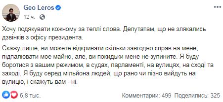 "Хочу подякувати кожному за теплі слова. Депутатам, що не злякались дзвінків з Офісу президента. Скажу лише, ви можете відкривати скільки завгодно справ на мене, підпалювати моє майно, але, ви покидьки мене не зупините. Я буду боротися з вашим режимом, в судах, парламенті, на вулицях, на сході та заході. Я буду серед мільйона людей, що рано чи пізно вийдуть на вулицю, і скажуть вам — ні", - заявив Лерос у своєму повідомленні.