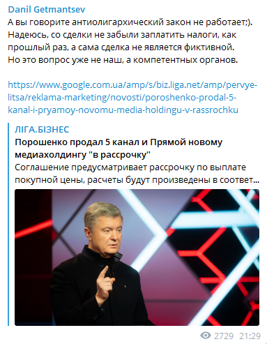 Після того, як було утворено новий медіахолдинг "Вільні медіа", у який увійшли "5 канал" і канал "Прямий", корпоративні права перейшли до журналістів. Голова Комітету Верховної Ради Данило Гетманцев висловив сподівання, що Петро Порошенко "не забув" сплатити податки від угоди про продаж своїх каналів. Про це Гетманцев зазначив у своєму Телеграм-каналі.