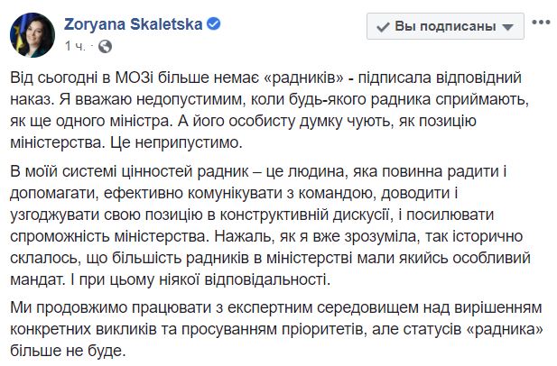 "Від сьогодні в МОЗі більше немає "радників" - підписала відповідний наказ. Я вважаю недопустимим, коли будь-якого радника сприймають, як ще одного міністра. А його особисту думку чують, як позицію міністерства. Це неприпустимо", - написала Скалецька.