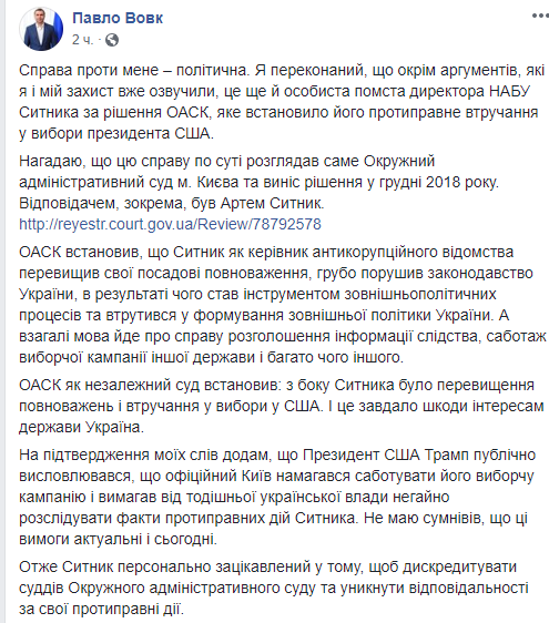 "Справа проти мене – політична. Я переконаний, що окрім аргументів, які я і мій захист вже озвучили, це ще й особиста помста директора НАБУ Ситника за рішення ОАСК, яке встановило його протиправне втручання у вибори президента США. Нагадаю, що цю справу по суті розглядав саме Окружний адміністративний суд м. Києва та виніс рішення у грудні 2018 року. Відповідачем, зокрема, був Артем Ситник", - зазначив Вовк.