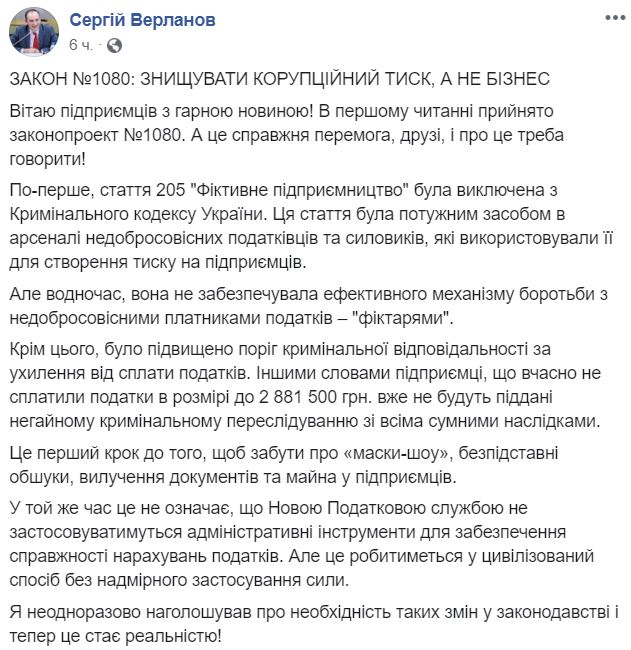 Ухвалення у першому читанні законопроєкту №1080 є справжньою перемогою для підприємництва, вважає голова Державної податкової служби України Сергій Верланов.