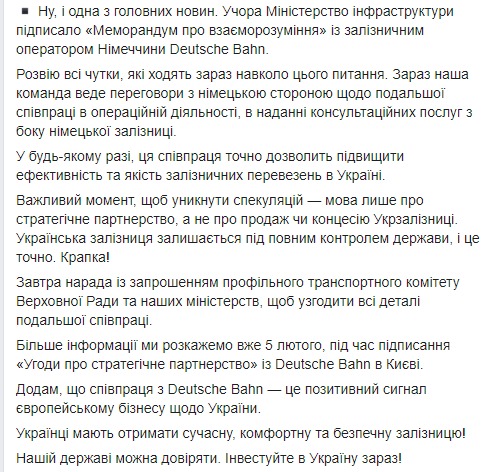 "Розвію всі чутки, які ходять зараз навколо цього питання. Зараз наша команда веде переговори з німецькою стороною щодо подальшої співпраці в операційній діяльності, в наданні консультаційних послуг з боку німецької залізниці. У будь-якому разі, ця співпраця точно дозволить підвищити ефективність та якість залізничних перевезень в Україні. Важливий момент, щоб уникнути спекуляцій — мова лише про стратегічне партнерство, а не про продаж чи концесію Укрзалізниці", - написав Гончарук.