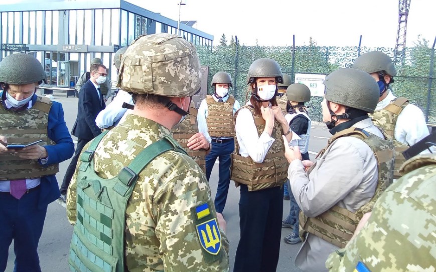 На схід нашої держави чиновники дісталися вертольотом. На контрольному пункті в'їзду-виїзду європейські політики були в касках та бронежилетах. Також Боднар повідомив про те, що керівництво Луганської обласної військово-цивільної адміністрації організувало відповідний брифінг для міністрів.