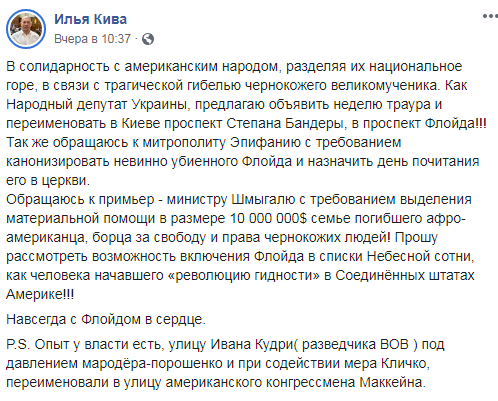 Народний депутат від "Опозиційної платформи - За Життя" Ілля Кива запропонував оголосити тиждень жалоби і перейменувати в Києві проспект Степана Бандери в проспект Флойда. Про це політик написав на своїй сторінці у Facebook.