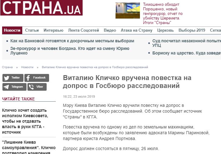 Треба зазначити, що напередодні видання "Страна" опублікувала замітку про те, що главі міськадміністрації Києва Віталію Кличку вручили повістку на допит в Державне бюро розслідувань.