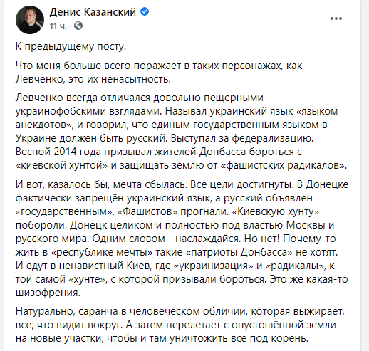 Член української делегації в ТКГ з врегулювання конфлікту на Донбасі, журналіст Денис Казанський повідомив в соцмережі, що колишній народний депутат від "Партії регіонів" Микола Левченко, який з 2015 року переховувався в Росії від правосуддя, повернувся в Україну. Як виявилося, всі кримінальні справи проти Левченко в Україні закриті.