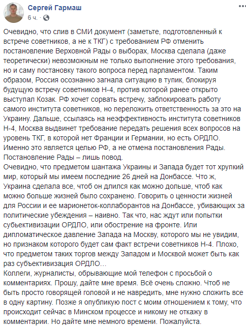Журналіст зазначає, що цим Росія свідомо загнала ситуацію в глухий кут, блокуючи майбутню зустріч радників Н-4, проти якої раніше відкрито виступав Козак. У планах РФ зрив зустрічі, щоб заблокувати роботу самого інституту радників, але перекласти відповідальність за це на Україну. А далі Москва висуне вимогу передати вирішення всіх питань на рівень ТКГ, в якій немає Франції та Німеччини, але є ОРДЛО. В цьому і є кінцева мета Росії, а не скасування постанови Ради, що лише привід. За словами Сергія Гармаша, Росія буде шантажувати Україну і захід перемир'ям на Донбасі, яке триває вже 26 днів.