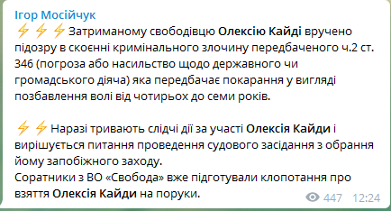 "Затриманому свободівця Олексію Кайді вручено підозру в скоєнні кримінального злочину передбаченого ч. 2 ст. 346 (погроза або насильство у відношенні державного чи громадського діяча,) яка передбачає покарання у вигляді позбавлення волі від чотирьох до семи років. Зараз тривають слідчі дії за участю Олексія Кайди і вирішується питання про проведення судового засідання з обрання йому запобіжного заходу. Соратники з ВО "Свобода" вже підготували клопотання про взяття Олексія Кайди на поруки".