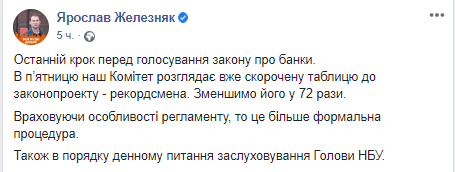 У тексті йдеться про те, що перед голосуванням за закон про банки залишився останній крок: " В п’ятницю розглянемо скорочену таблицю до закону про банки. Законопроєкт буде зменшено у 72 рази."
