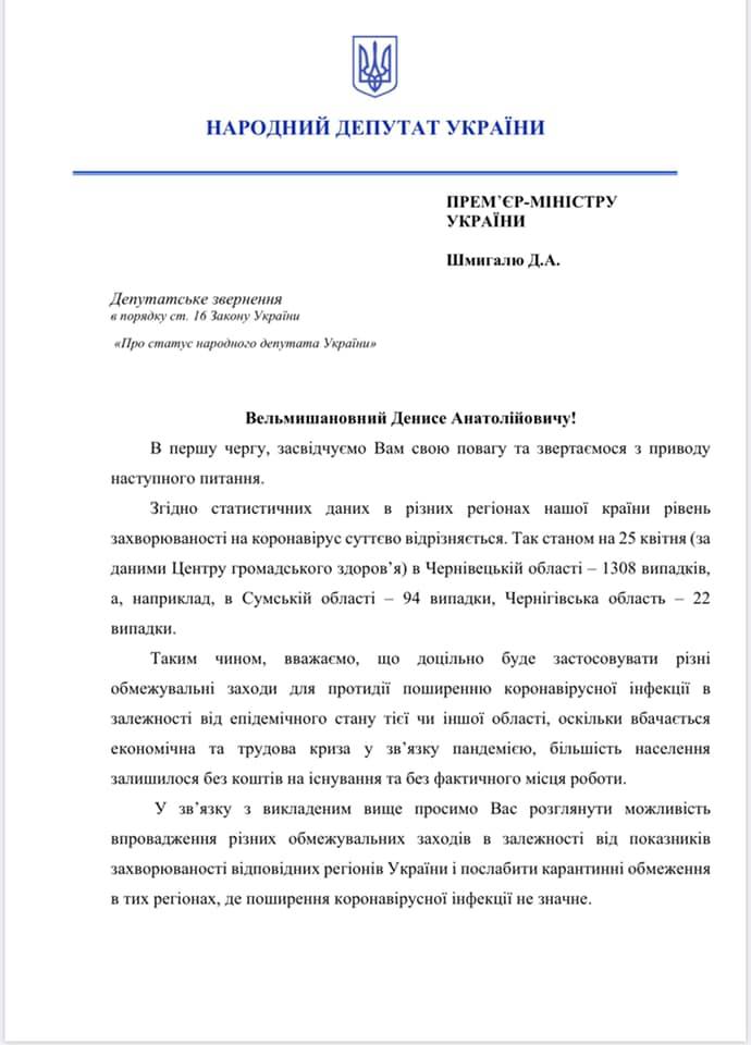 У зверненні депутати пропонують послабити обмежувальні заходи там, де рівень зараження коронавірусом відносно низький. Вони аргументують це потребою врятувати економіку та боротьбою з безробіттям.