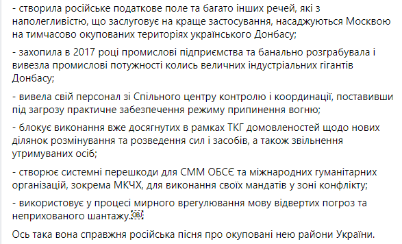 За словами Дмитра Кулеби, йому особливо прикро читати ці слова міністра Лаврова саме зараз, коли Україна докладає як ніколи багато зусиль саме для того, щоб врегулювати конфлікт, принести мир, деокупувати свої території Донецької та Луганської областей. Кулеба нагадав, що Росія за час війни на Донбасі "нафарширувала ОРДЛО зразками російського озброєння, зокрема найновіших та експериментальних, які використовують на українській землі як на армійському полігоні". За словами українського міністра, Росія постійно здійснювала артилерійські обстріли української території, збила пасажирський авіалайнер рейсу MH17 з російської установки "Бук", запровадила російський рубль та нав’язала російські паспорти українцям, які мешкають в окупації.