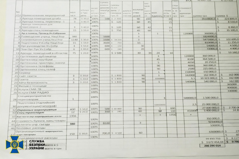 "Для силового повалення влади фігуранти розробили план проведення "Національних зборів", які мали зібратися у Києві та оголосити про відсторонення президента, розпуск Верховної ради і уряду", - говорять в СБУ.