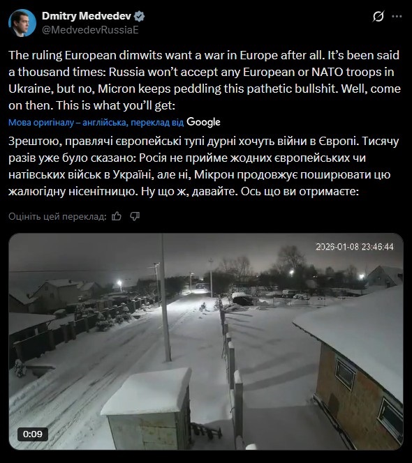 Медведєв вчергове заявив, що Росія проти розміщення військ будь-якої країни НАТО на території України. "Європейські недоумки при владі все ж таки хочуть війни в Європі. Вже тисячу разів було сказано: Росія не прийме жодних європейських чи натовських військ в Україні, так ні ж, "Мікрон" продовжує поширювати цю жалюгідну нісенітницю. Ну, тоді спробуйте. Ось що ви матимете", – написав Медведєв.