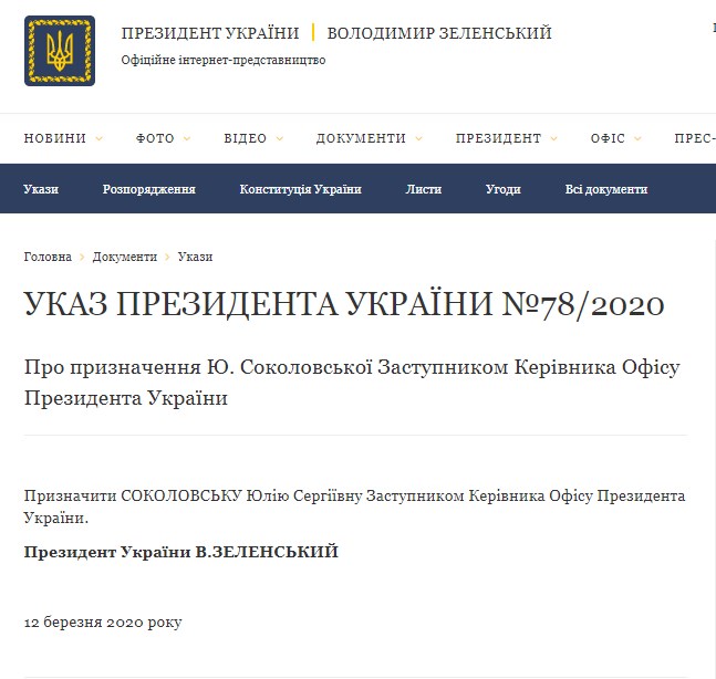 "Призначити Соколовську Юлію Сергіївну заступником керівника Офісу президента України", - йдеться в президентському указі №78/2020, підписаному в четвер, 12 березня.