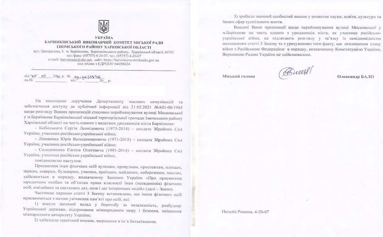 Автор публікації зазначив, що звернувся з пропозицією до Барвінківської міської ради стосовно перейменування вулиці Московської на території міста Барвінкове на честь одного з трьох уродженців міста - загиблих у війні з Росією. У відповіді депутати вказали, що "топонімам присвоюються імена фізичних осіб, які внесли вагомий вклад у боротьбу за незалежність, розбудову Української держави та здійснили героїчний вчинок в ім’я Батьківщини".
